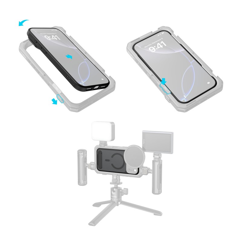 Leichte SmallRig FilMov Cage für iPhone 17 Pro Max, optimiert für Foto und Video. Bietet MagSafe-Kompatibilität, T-Mount- und 17mm-Objektivhalterungsplatten sowie einen integrierten Ständer. Ideal für anspruchsvolle Kreative.Empfänger :