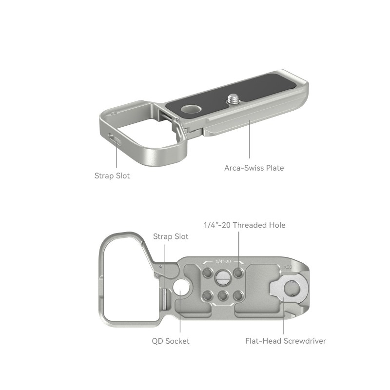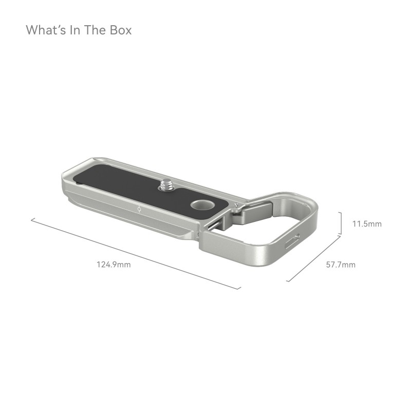 Diese elegante silberne Aluminiumplatte bietet optimalen Schutz der Kameraunterseite, erleichtert das schnelle Anbringen an Stativen oder Stabilisierungssystemen und sorgt dank des perfekt angepassten Schwenkarms, der sich der Kurve des Kameragehäuses anpasst und Platz für den kleinen Finger lässt, für überlegenen Komfort.